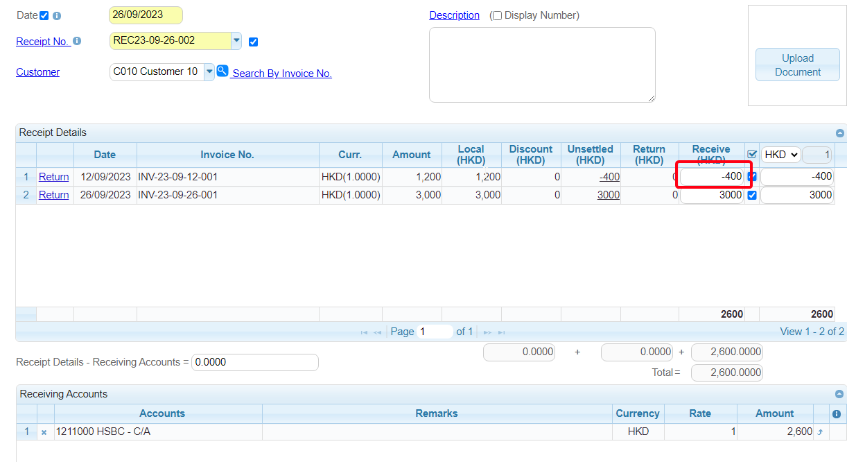在發票扣減按金:除了發票原有資料外,新增一行,科目選客戶按金,金額輸入扣減按金的金額,需要輸入負數以扣減。